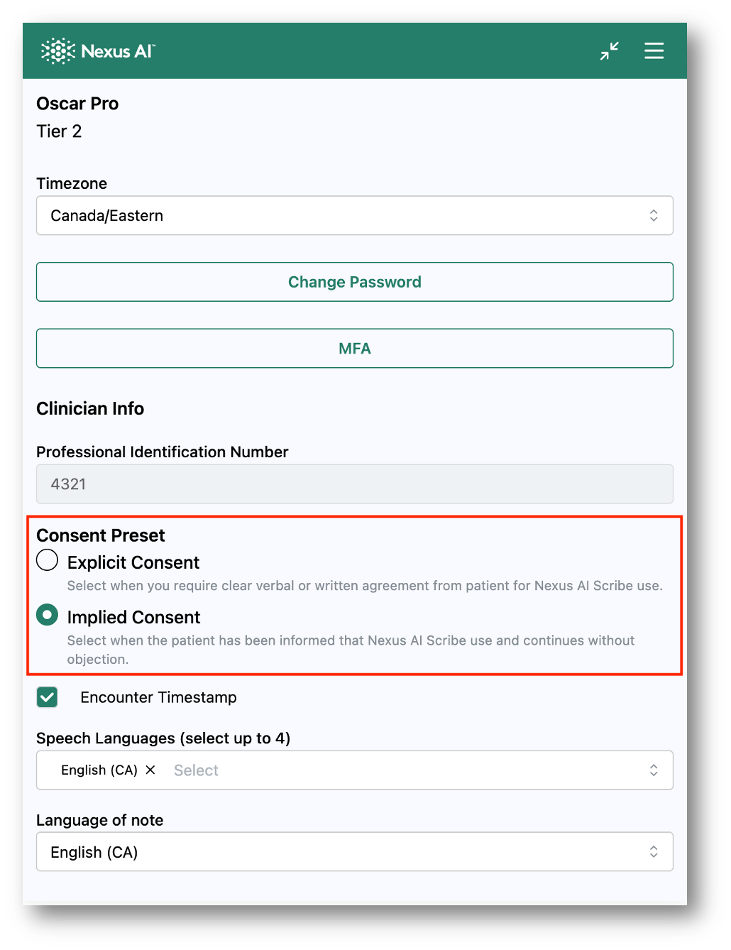 The scribe defaults to an implied consent system where it will not automatically prompt you to obtain the patient’s consent for each encounter. If you or your clinic would like to have the scribe prompt for consent ahead of each patient encounter, please enable explicit consent.