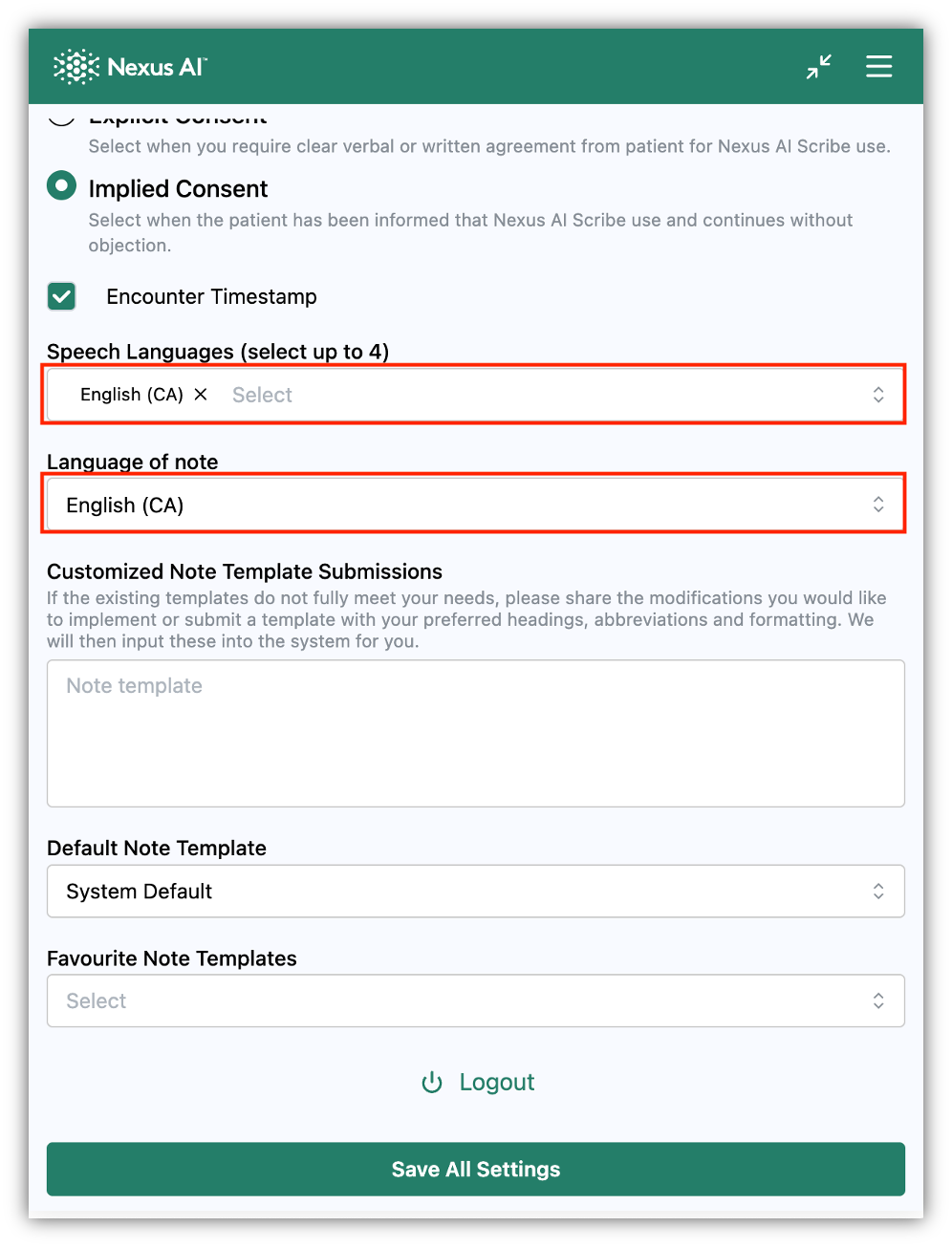 Scroll down to find the Speech Languages and Language of Note sections. Use the dropdown menus in each section to customize your language settings.