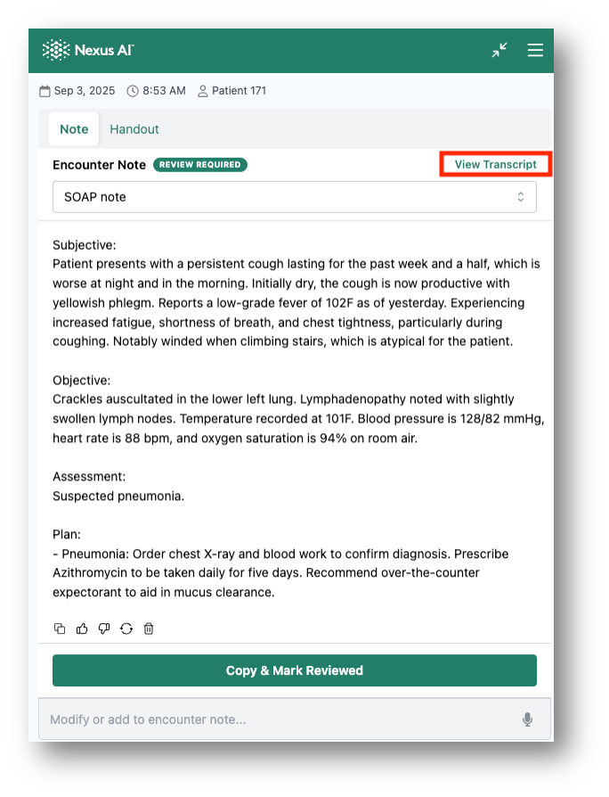 Once you've finished recording and your clinical note has been generated, you can also access the complete transcript. Click "View Transcript" to access the full encounter documentation.